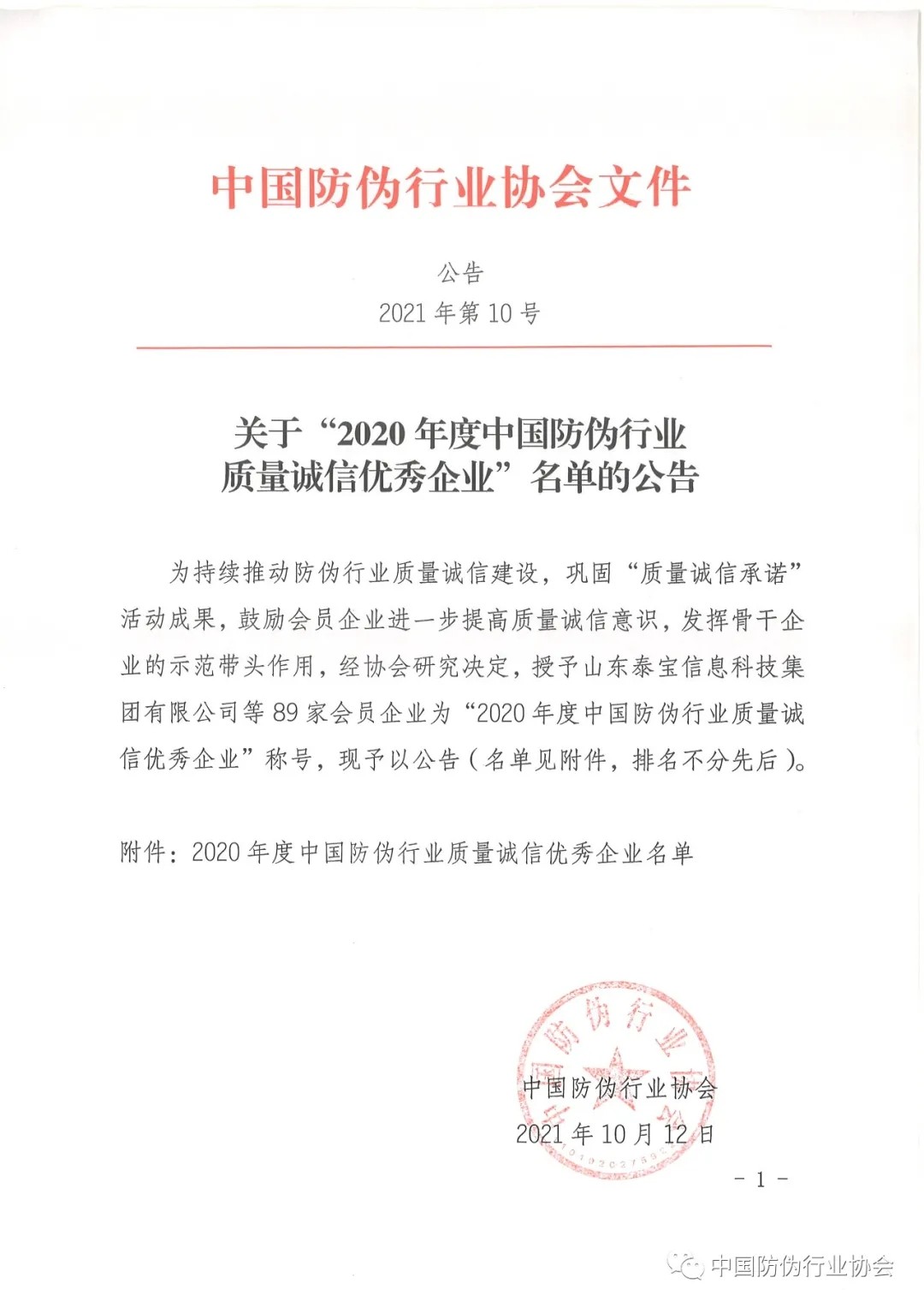 關(guān)于“2020年度中國防偽行業(yè)質(zhì)量誠信優(yōu)秀企業(yè)”名單的公告